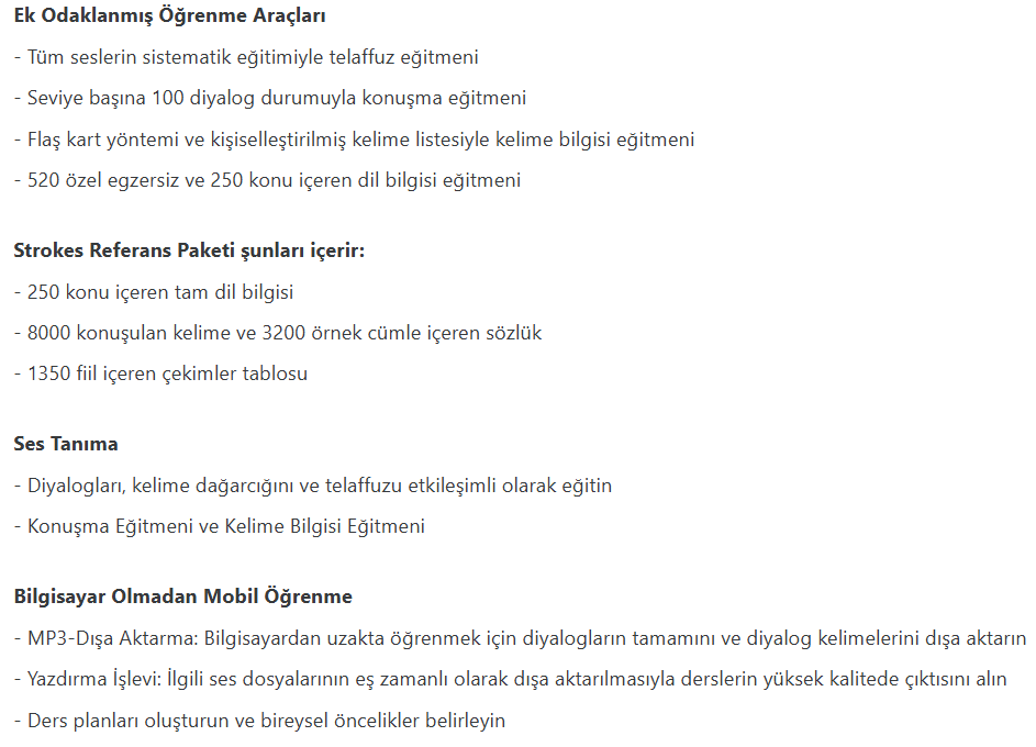 Öncelikle programın gramer veya ütopik bir dil öğretmediğini belirtelim. Uygulamayı kullanarak günlük hayatta konuşulan pratik dili öğreniyoruz. Ayrıca öğreniş amacınıza bağlı olarak akademik, iş gibi alanlara yönelik olarak da dil kursları alabilmeniz mümkün. Farklı seviyelere uygun olan hazırlanan onlarca ders programı bulunuyor. Kendi seviyenizi belirleyerek sizin için en verimli olabilecek kursları alabiliyorsunuz. Programın içerisinde: