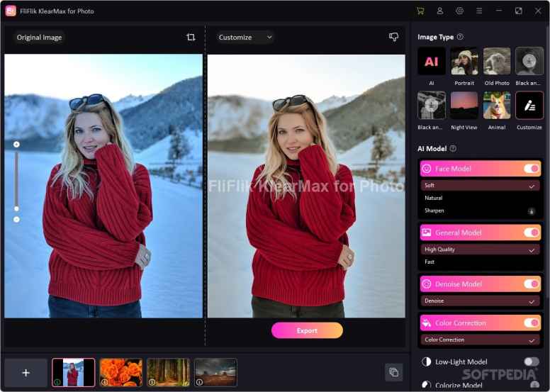 FliFlik KlearMax for Photo, HD, 2K, 4K ve 8K çözünürlüğünde tüm fotoğrafları desteklemekte ve resimleri JPG, PNG, BMP ve WEBP formatlarında kaydedebilmektedir. İster tek fotoğraf isterseniz de toplu fotoğraf işleyebilirsiniz. Kontrast ve renk ayarının keskinliğini değiştirebilir, fotoğraflarınızı dönüştürebilir ve anime özelliğinde gerçekçi fotoğraflar kaydedebilirsiniz.