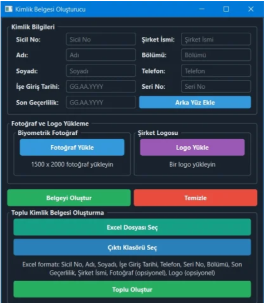 Şirket logosu, şirketin adı, işe giriş tarihi gibi verileri uygulamaya verdiğinizde size ön ve arka yüzleri olan gerçekçi bir kimlik tasarlıyor. İsterseniz birden fazla kişiye kart düzenlemek için istenen bilgileri bir excel dosyasında hazırlayarak programa yükleyebilirsiniz. Ardından Toplu Oluştur butonuna bastığınızda ekteki excel içerisinde bulunan tüm kişiler adına kimlik kartları düzenlenecektir. Hemen denemek için Personel kimlik kartı oluşturucu indir.