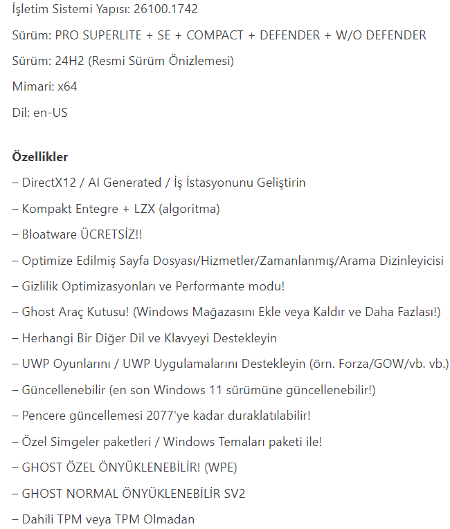 Windows 11 Pro Lite Ghost Spectre, önyükleme yapabilen, defender ve defendersiz özellik destekli, Windows Recovery özelliği bulunan ve Ghost Toolbox ile onedrive’yi geri yükleyebilen bu sistemle farklı bir kullanıcı deneyimi yaşamaya hazır olun. NFS desteği de vardır.